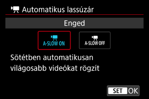 Lehetővé teszi, hogy a(z) [Enged] beállításhoz képest simább, természetesebb mozgással rögzítse a videókat, amelyekre a téma bemozdulása is kevésbé hat. A(z) [Enged] lehetőség beállítása esetén rossz fényviszonyok között a videók sötétebbek lehetnek.