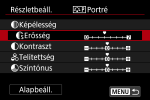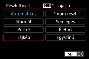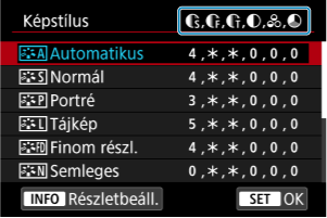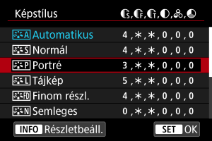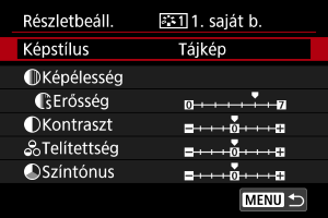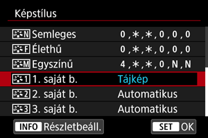 Kiválaszthat egy alap képstílust, például a(z) [Portré] vagy a(z) [Tájkép] stílust, igény szerint beállíthatja a paramétereit, és [1. saját b.] – [3. saját b.] néven tárolhatja ezeket. Ez akkor hasznos, ha eltérő beállításokkal rendelkező különböző képstílusokat szeretne létrehozni.
