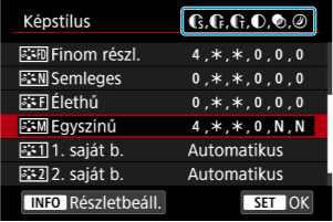 Az alapértelmezett beállítások módosításához bármelyik képstílust személyre szabhatja. A(z) [Egyszínű] képstílus testre szabásához lásd: Egyszínű beállítás.