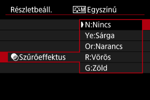 | N:Nincs | Normál fekete-fehér kép szűrőeffektusok nélkül. |