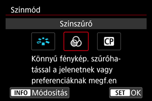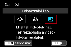 A kívánt videó- vagy állóképjellemzőket a Képstílus, a Színszűrő vagy az Egyéni kép menüpontban állíthatja be.