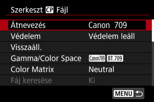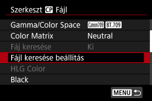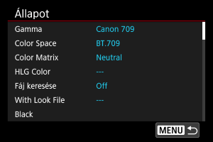 - Nem használható a regisztrált look fájl, ha a regisztrálást követően módosítja a(z) [Gamma/Color Space], [HLG Color] vagy [Over 100%] beállítást.