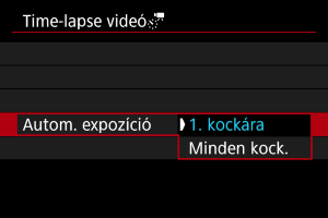 - Ha a felvételek között jelentős eltérés van a fényerőben, akkor előfordulhat, hogy a fényképezőgép nem képes a megadott időközzel elkészíteni a képeket, amikor a(z) [Időköz] beállítása 3 másodpercnél kevesebb, és a(z) [Autom. expozíció] beállítás a(z) [Minden kock.] lehetőségre van állítva.