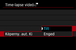 - A time-lapse videók készítésének kikapcsolásához állítsa a(z) [Time-lapse] beállítást a(z) [Tilt] értékre.