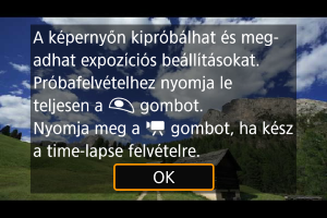 - Az javasoljuk, hogy első lépésként készítsen próbafelvételeket és próba time-lapse videókat a 13. lépésben leírtaknak megfelelően.