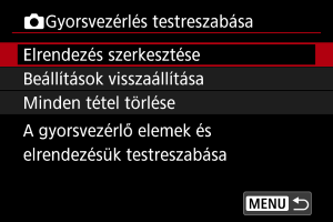 - A Gyorsvezérlés képernyő alapértelmezett elemeinek és elrendezésének visszaállításához válassza ki a(z) [Beállítások visszaállítása] lehetőséget.
