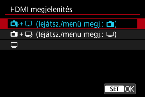 A videók a fényképezőgépen és a HDMI-n keresztül csatlakoztatott eszközön is megjelennek. A fényképezőgép műveletei, például a képlejátszás vagy a menü megjelenítése a fényképezőgépen történik.