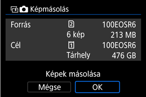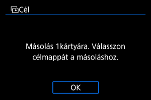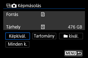 kivál.] vagy [Minden k.] lehetőségének kiválasztásával a mappában vagy a kártyán lévő összes képet átmásolhatja.
