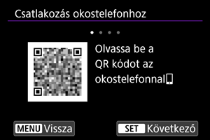 - Ha nincs telepítve a Camera Connect, olvassa be az okostelefonnal a képernyőn megjelenő QR-kódot, nyissa meg a Google Play vagy az App Store áruházat a Camera Connect letöltéséhez, majd nyomja meg a(z)