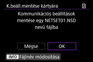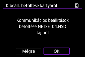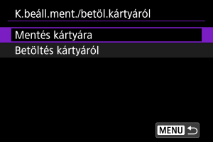 : Beáll.ment./betölt.kártyáról] opció segítségével a fényképezőgépen tárolt minden kommunikációs beállítást kártyára menthet, illetve betöltheti a más fényképezőgépekkel konfigurált és kártyára mentett összes kommunikációs beállítást.
