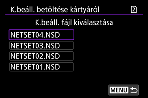 - A más fényképezőgép-típusok által mentett beállítási fájlok nem tölthetők be.