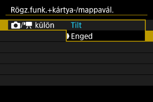 Az állóképekhez és videókhoz használt rögzítési mód automatikus konfigurálásához válassza a(z) [Enged] lehetőséget. A videókat a(z) kártyára, az állóképeket pedig a(z)