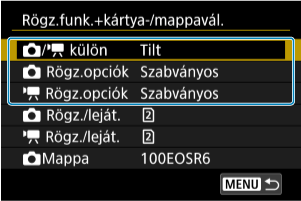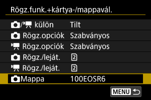 Ha két kártyát használ a fényképezőgépben, megadhatja a használat módját, és azt, hogy a rendszer melyik kártyát használja a képek rögzítésére és lejátszására. Állóképek rögzítéséhez mappák is megadhatók.