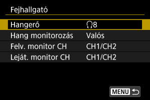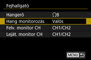 A videófelvétel során kiválaszthatja a fejhallgató-kimenethez használt hangot. A hangfelvétel során a zaj csökkentéséhez konfigurálja a(z) [Hang zajcsökkent.] () beállítást.