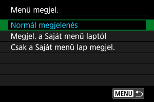 A(z) [Menü megjel.] állíthatja be azt a menüképernyőt, amely a(z) gomb megnyomásakor először megjelenik.