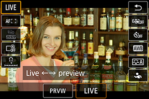 LIVE] is displayed in the upper right during previewing or streaming, respectively.