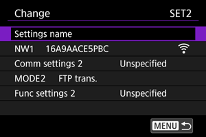 You can use communication and function settings saved on the camera to change connection settings saved on the camera. You can also register settings names.