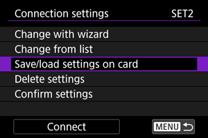 Save connection settings to a card, or load saved connection settings from a card into the camera ().