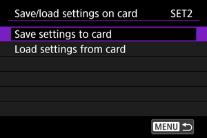 : Save/load cam settings on card] enables you to save all communication settings on the camera to a card or load all communication settings for another camera from a card.