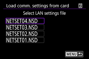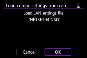 : Save/load cam settings on card] enables you to save all communication settings on the camera to a card or load all communication settings for another camera from a card.