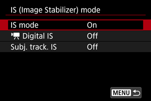 Activates image stabilization using lens IS. Displayed when IS lenses without an IS switch are used. Not displayed for other lenses.