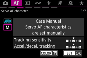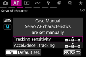 You can set Servo AF tracking parameters (subject tracking sensitivity and acceleration/deceleration tracking) for the subject and shooting situation.