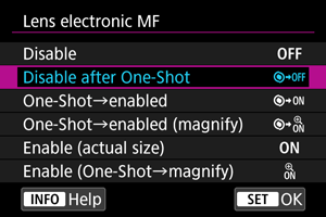 Disables manual focus adjustment after One-Shot AF operation when [Shutter butt. half-press] in [Control customization: Customize buttons for shooting] is set to an option other than [Metering and AF start].