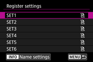 • Current camera settings are listed on the screen in step 4, which is used to register settings. The items listed on this screen cannot be changed.