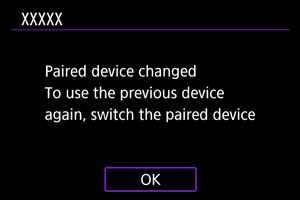 - A message is displayed if the camera is already paired with another device. Select [OK] to end the current Bluetooth connection.