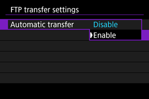 When [Enable] is set and no image is transferred for a certain period, the camera will log off from the FTP server and end the Wi-Fi connection. The connection is re-established automatically when the camera is ready for image transfer again. If you prefer not to end the Wi-Fi connection, set to [Disable].