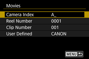 A 3-digit number from 001 to 999 preceded by C, as in C001–C999. After C999, D is used at the beginning. Automatically assigned to each clip (movie file). You can set the default value. |