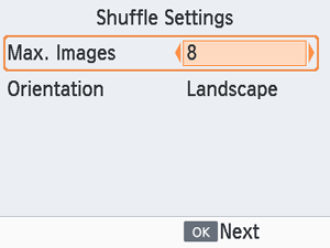 - To use shuffle print for up to 8 images, set [Max. Images] to [8], and for 9–20 images, set it to [20].