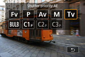 In this mode, you set the shutter speed and the camera automatically sets the aperture value to obtain the standard exposure matching the brightness of the subject. A faster shutter speed can freeze the action of a moving subject. A slower shutter speed can create a blurred effect, giving the impression of motion.