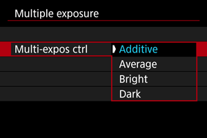 - With [Continuously], multiple-exposure shooting continues until the setting in step 2 is set to [Disable].