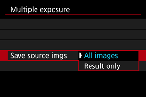 With [Save source imgs: All images], saves all single exposures and the multiple-exposure image created so far and exits multiple-exposure shooting. With [Save source imgs: Result only], saves only the multiple-exposure image created so far and exits multiple-exposure shooting. |