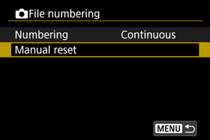 Note that file numbering may continue from any existing images in cards or folders that you switch to. If you want to save images with the file numbering starting from 0001, use a newly formatted card each time.