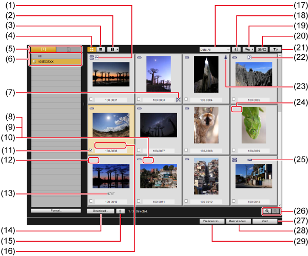 • 2: Shows ratings set on the camera or in Digital Photo Professional Ver. 3.9 or later. Note that [Reject] ratings are not displayed. Ratings cannot be set with EU.