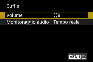 È possibile scegliere l'audio durante la registrazione di filmati utilizzato per l'uscita dalle cuffie. Per ridurre il disturbo durante le registrazione di audio, configurare [Riduz.distur.audio] ().