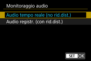 - Se si seleziona [Audio registr. (con rid.dist.)], l'uscita audio potrebbe non essere completamente sincronizzata con il video. L'audio nei filmati registrati non è in ritardo.