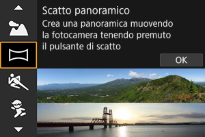 Utilizzare la modalità [] (Scatto panoramico) per scattare foto di panorami. Il panorama viene creato unendo gli scatti acquisiti durante lo scatto continuo mentre si sposta la fotocamera in una direzione e si preme completamente il pulsante di scatto.