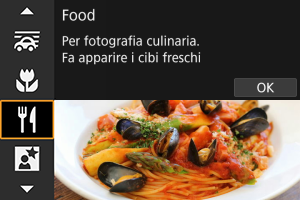Utilizzare la modalità [] (Food) per la fotografia gastronomica. La foto apparirà luminosa e stuzzicante. Inoltre, la tonalità rossastra dovuta alla sorgente di luce verrà eliminata nelle foto scattate in ambienti con luce al tungsteno, ecc.