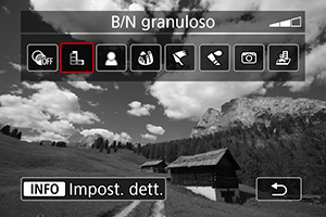 - Con l'opzione [B/N granuloso], l'anteprima sgranata sarà leggermente diversa dall'aspetto degli scatti.