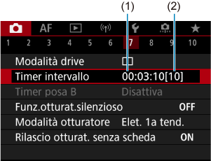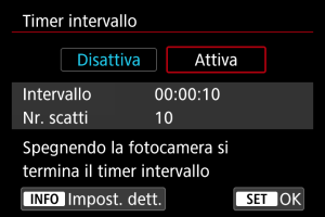 - È possibile interrompere lo scatto con timer intervallo selezionando [Disattiva] oppure portando l'interruttore di accensione su
