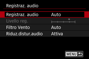 : Registraz. audio] sono [Sì] e [Disattiva]. Impostarlo su [Sì] affinché il livello di registrazione venga regolato automaticamente.