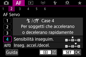 Nelle seguenti situazioni, selezionare da [Case 2] a [Case 4]: soggetti inanimati che si muovono attraverso i punti AF, soggetti sfuggenti o soggetti che appaiono all'improvviso o che cambiano velocità.