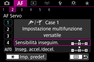 Impostazione per AF Servo, sensibilità di inseguimento dei soggetti in risposta a soggetti inanimati che non si spostano tra i punti AF o soggetti che si allontanano dai punti AF.