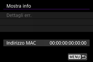 È possibile verificare i dettagli degli errori e l'indirizzo MAC della fotocamera.