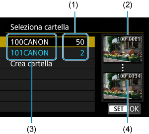 - Le cartelle sono denominate come "100CANON", con un numero di cartella a tre cifre seguito da cinque lettere o numeri. Una cartella può contenere fino a 9999 immagini (numeri dei file da 0001 a 9999). Quando una cartella si riempie, viene creata automaticamente una nuova cartella con il numero aumentato di uno. Inoltre, se si esegue un azzeramento manuale (), viene creata automaticamente una nuova cartella. È possibile creare cartelle numerate da 100 a 999.