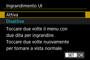 È possibile ingrandire le schermate dei menu toccando due volte con due dita. Toccare ancora due volte per ripristinare le dimensioni di visualizzazione originali.