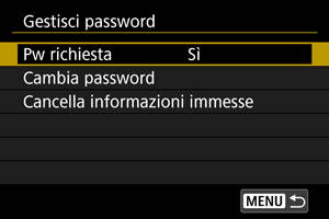 Utilizzare queste impostazioni per gestire la password immessa quando l'interruttore di accensione è impostato su Accensione o la fotocamera riprende il funzionamento dallo spegnimento automatico. Per istruzioni su come impostare la password richiesta all’avvio della fotocamera, vedere Impostare una password.